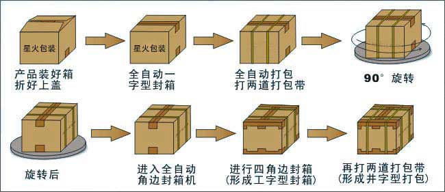 本包裝生產流水線主要操作流程:已裝好產品折好上蓋的產品箱從左邊的滾筒進入此流水線,進入第1臺包裝機械:全自動一字型封箱機(進行一字型封箱)—→進入第二臺包裝機械:全自動打包機(打兩道打包帶)—→進入第三臺包裝機械:90°旋轉機—→進入第四臺包裝機械:全自動角邊封箱機(進入四角邊封箱,形成工字型封箱)—→進入較后的第五臺包裝機械:全自動打包機(打另外兩道的打包帶,形成井字形打包)—→工字型封箱+井字型打包完成。